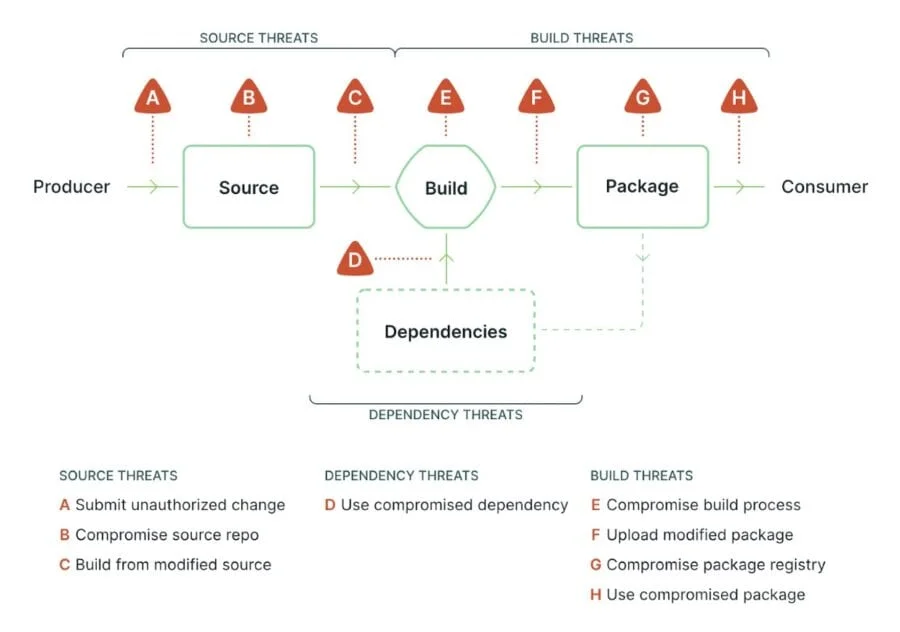 Простір назв атрибутів артефактів (artifact attribute namespace) у своїй першій реалізації мав декілька атрибутів. Один з ключових наборів атрибутів у цьому просторі імен охоплює attestations, що тісно повʼязано з моделлю SLSA. Це дійсно перший випадок, коли встановлюється прямий звʼязок між спостережуваністю та безпекою ланцюга постачання програмного забезпечення. Розглянемо наступну модель загроз ланцюга постачання, визначену SLSA: